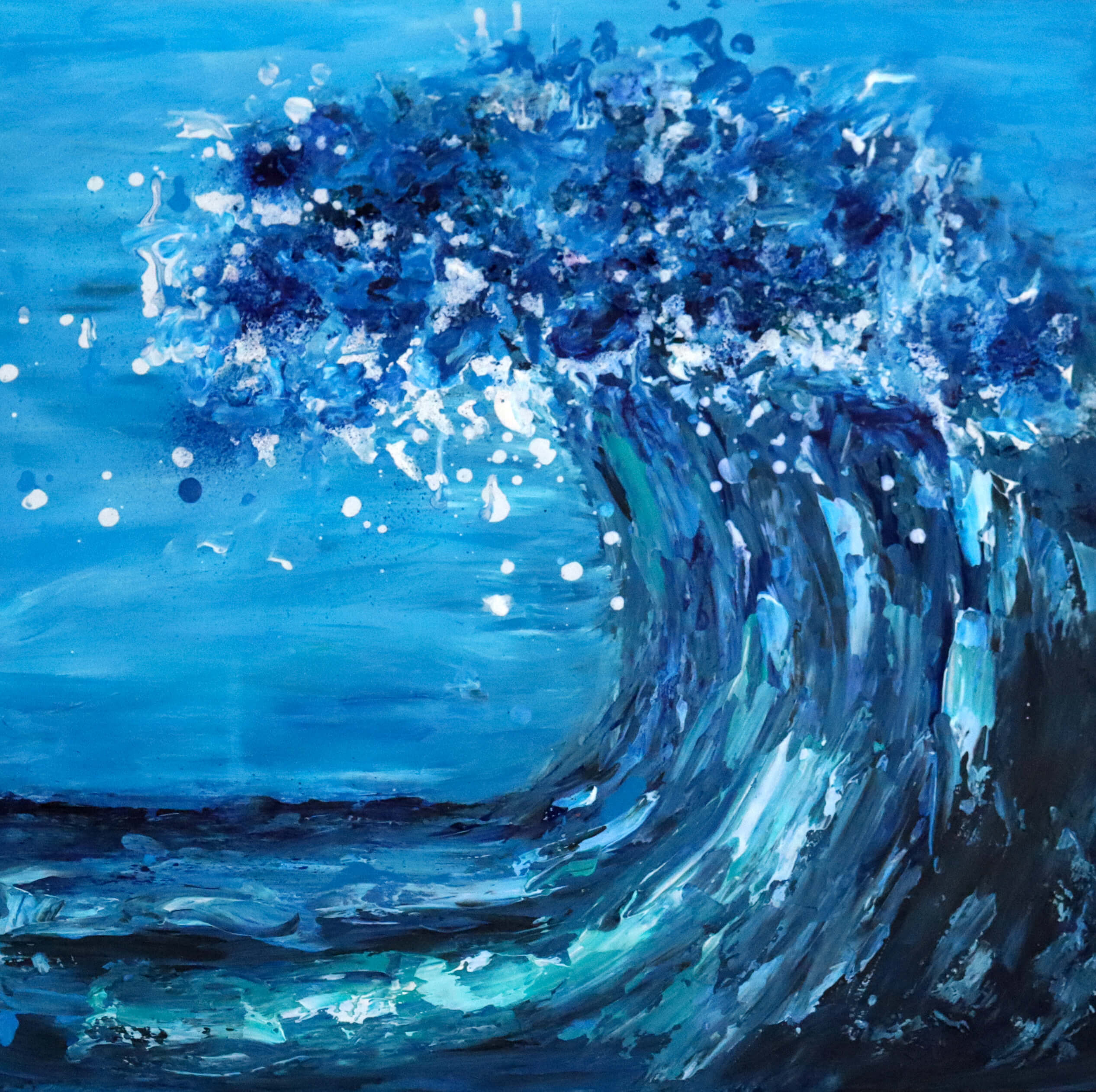 Framed acrylic painting on canvas capturing the power of a wave.
