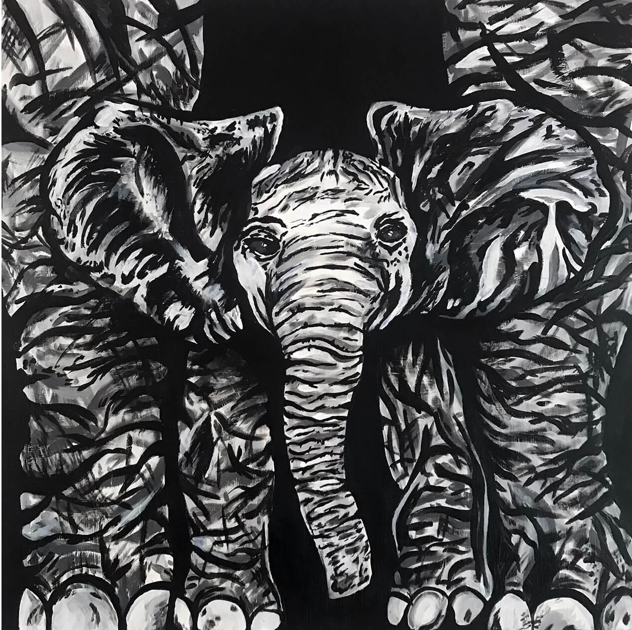 Black and white painting trying to convey the protective power of a mother's love through the baby elephant portrait.